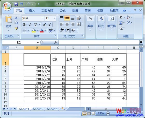 ③现在返回到工作表中我们可以看到表头处出现了一条斜线。在里面输入文字,如这里我输入:“地区日期”(如下图);