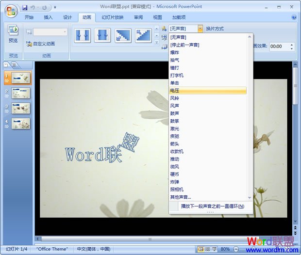 在演示PPT幻灯片时,如果能加上一些切换效果那么就显得更加生动了。其实在PowerPoint2007中本身就自带了许多种图片切换效果,可以给每张图片设置不同的效果,这样我们在演示时就像播放动画一般!下面Word联盟就详细的讲讲在PPT中如何设置好切换效果!