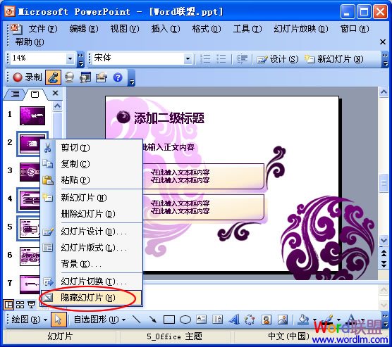 我们可以同时隐藏或显示多个幻灯片,按住Ctrl键 + 鼠标左键,单击选择左边的幻灯片,然后点击右键,在右键菜单中选择“隐藏幻灯片”。这样我们在预览的时候就不会看到被我们隐藏过的幻灯片了。