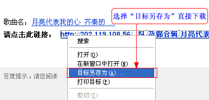 在歌曲地址上点击鼠标右键,在弹出的快捷菜单栏选“目标另存为”(如下图所示),然后选择好存放目录(即存放到哪个盘的哪个文件夹)即可将歌曲下载到 您的电脑里了。